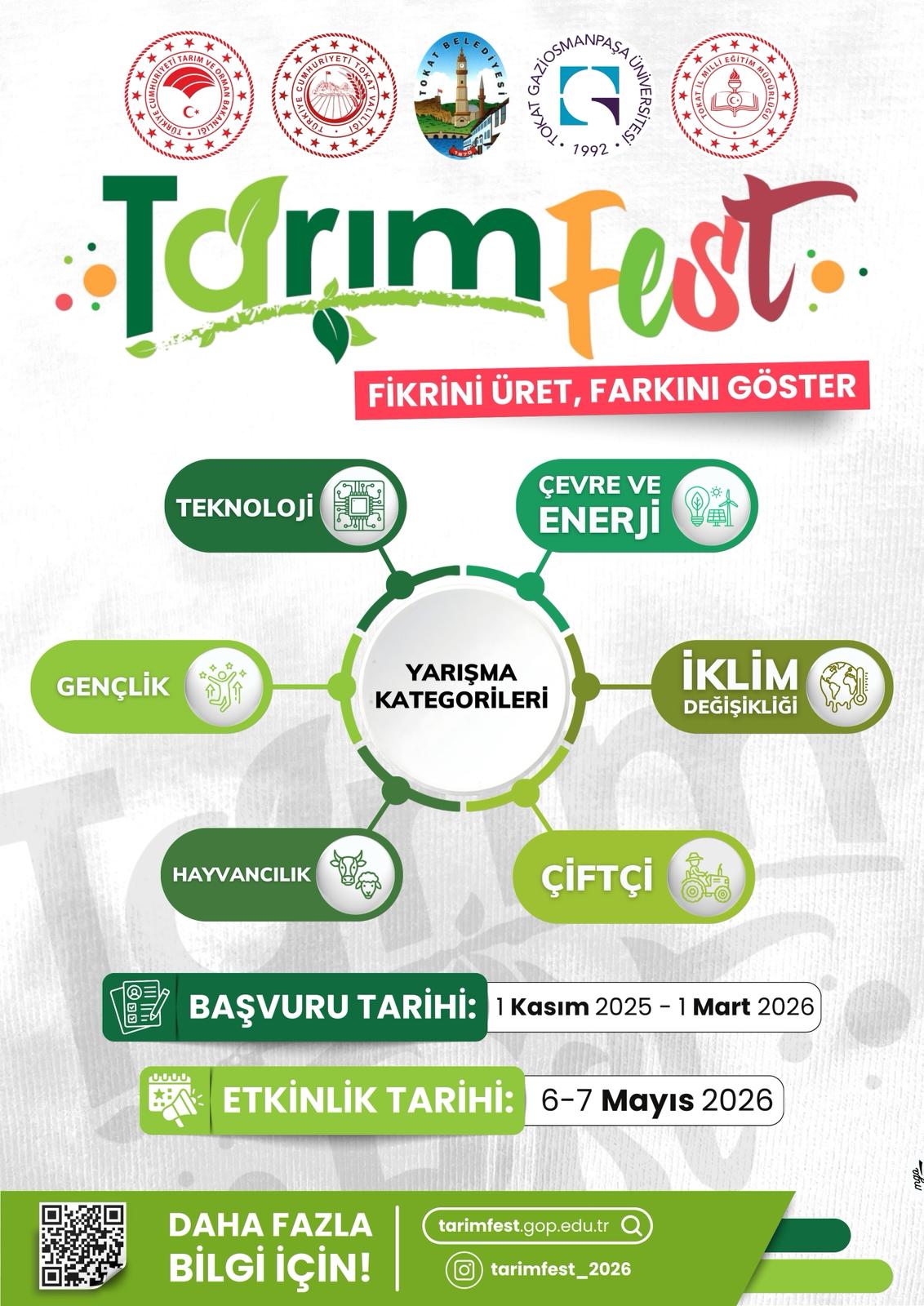 Tokat Gaziosmanpaşa Üniversitesi Ziraat Fakültesi ev sahipliğinde 6-7 Mayıs 2026 tarihlerinde TARIMFEST düzenlenecektir. Festival alanı toplamda 8.000 m2 olup, kapalı alanlar, açık sergi alanları, yarışma alanları, yemek ve aktivite alanlarından oluşmaktadır. Festivalde kurum/firma tanıtımları, etkinlikler, paneller ve bilimsel faaliyetlerin yanında çeşitli kategorilerde ödüllü proje yarışmaları düzenlenecektir.